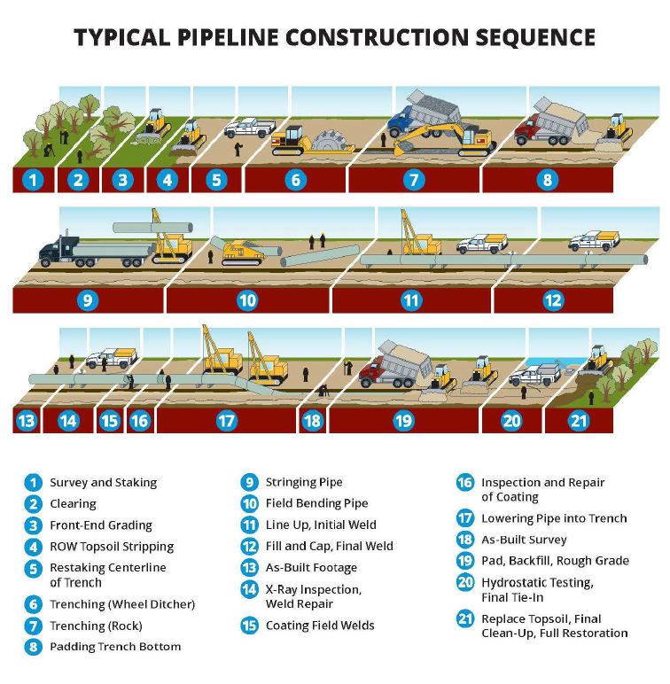Before construction of the pipeline occurs, surveys must be conducted and the crew must clear the area by removing trees, large rocks, and debris from the right-of-way. After clearing occurs, grading takes place to prepare a level surface for heavy construction activity. Equipment is then mobilized to dig the trench where the pipeline will lay, at a minimum of 36 inches below the surface, which surpasses the required minimum of 30 inches as regulated by the U.S. Department of Transportation. As dirt is removed, the topsoil and subsoil are often saved for later use in the restoration process.