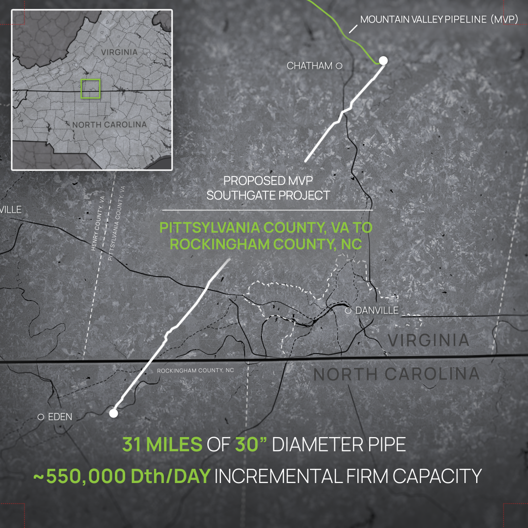 MVP Southgate is a proposed extension of the Mountain Valley Pipeline system that would receive gas near Chatham, VA (Pittsylvania County) and deliver to new interconnections in Rockingham County, NC. As an interstate project, it is regulated by the Federal Energy Regulatory Commission (FERC).